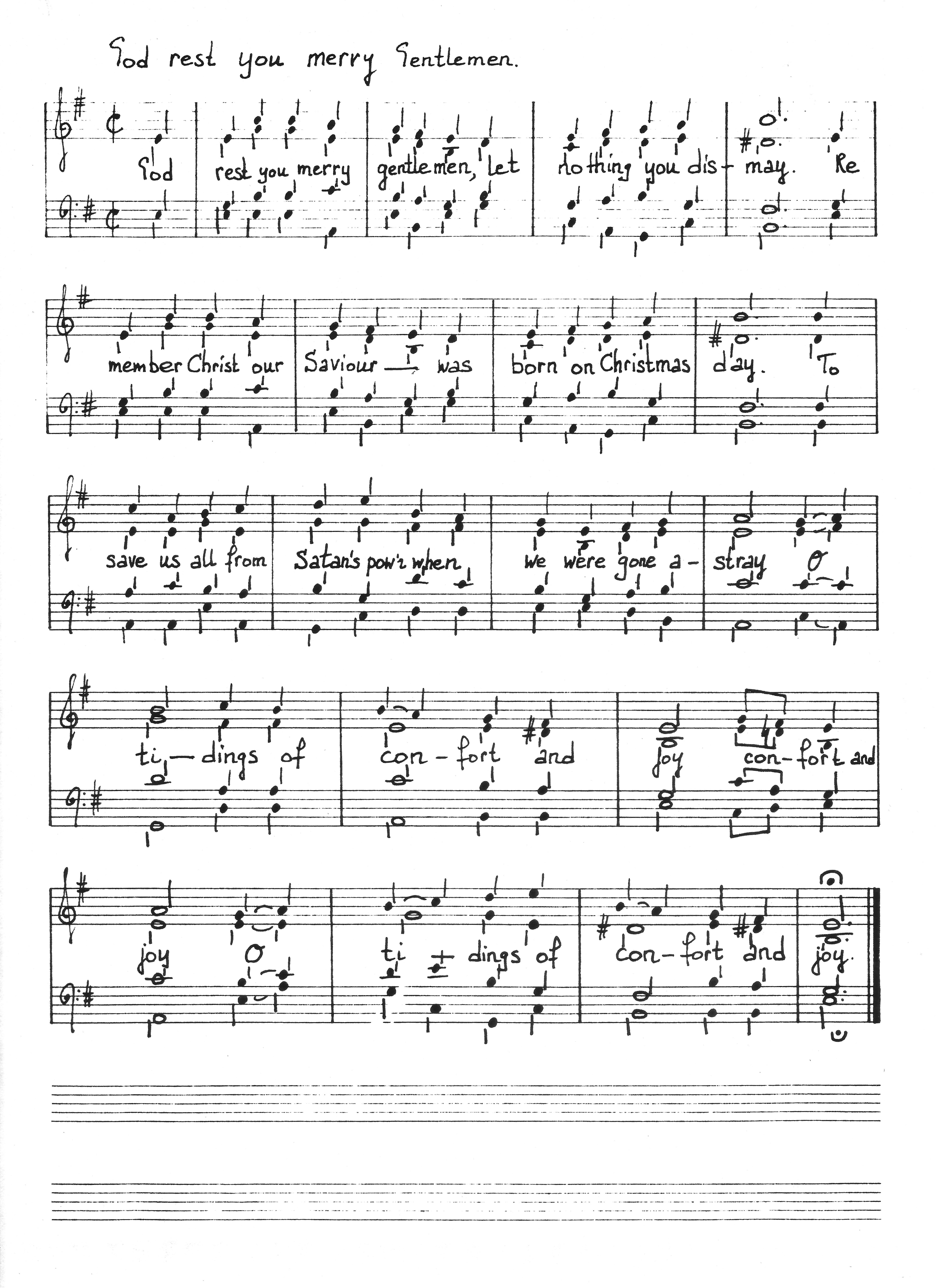Het moet in 1985 geweest zijn dat ik bij wijze van oefening een arrangement gemaakt heb van het Kerstlied "God rest you merry gentlemen” voor vierstemmig koor. In 2025 heb dit manuscript omgewerkt tot een uitgave in druk. Daarbij heb ik wel nog twee aanpassingen gemaakt: de basnoot op de eerste tel van maat 16 (een c in plaats evan een es) en de triolen in de tweede helft van maat 16. |