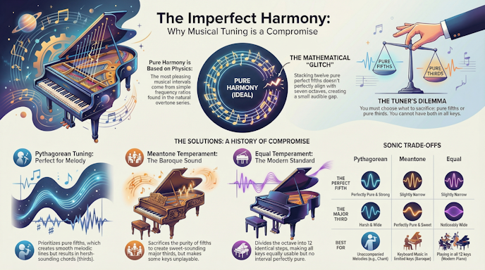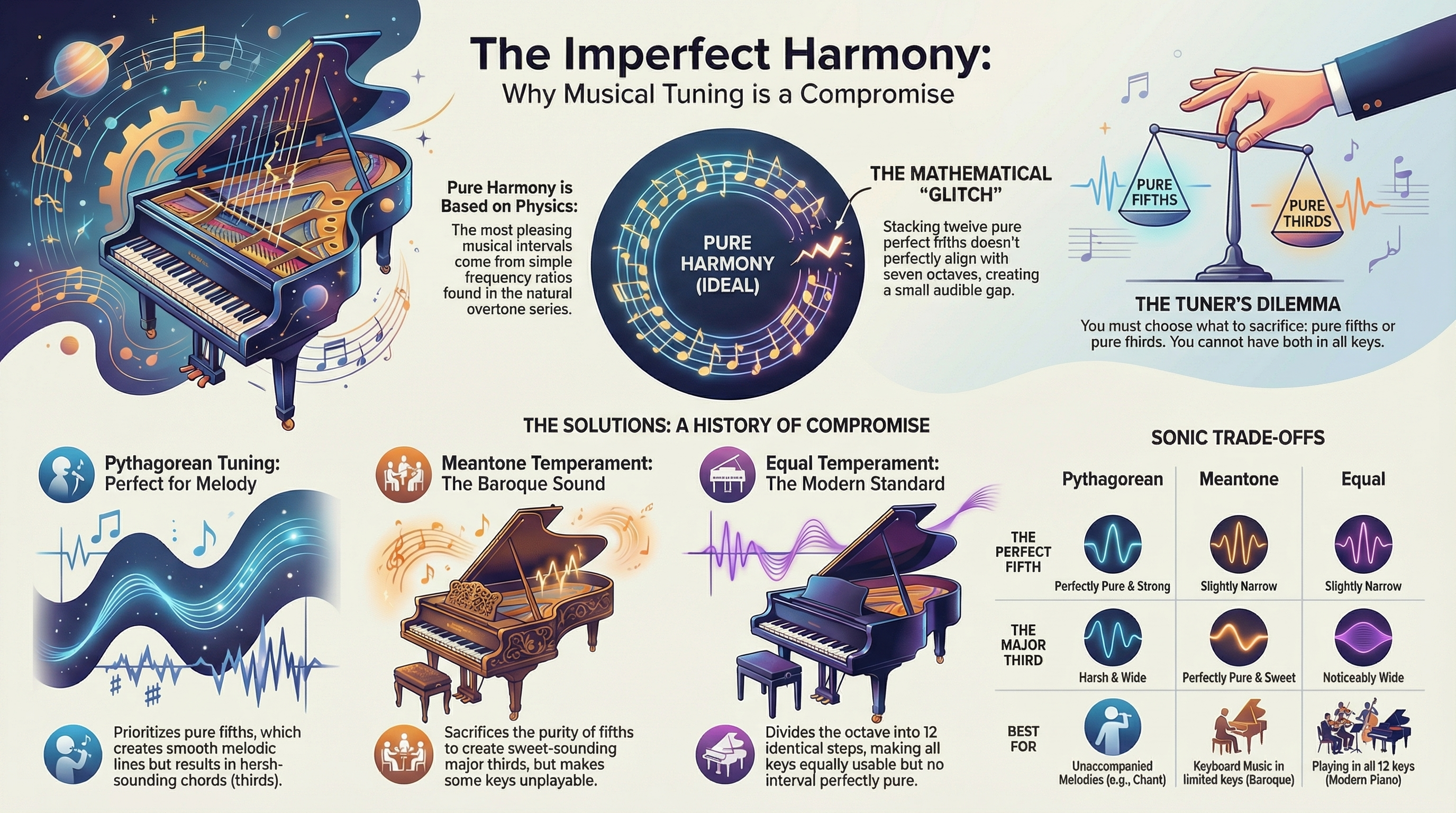 At the interface between music science and physics there is the problem how to tune keyboard instruments, a such instruments with a fixed pitch require an accurate definition of pitches. However, when we attempt to define such a musical ideal, it appears that, despite the fact that there are "perfect intervals", it is impossible to define a "perfect scale". The resulting differences can be expressed in micro-intervals such as the Pythagorean comma and the diësis.
